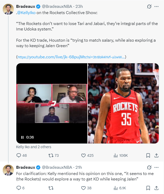 北京时间6月18日,TA记者凯利-伊科、队记Bradeaux、队记Biased三人在播客节目中透露——休斯顿火箭队正在探索留下杰伦-格林又换来凯文-杜兰特的方案,伊森、小贾巴里也不会纳入交易。